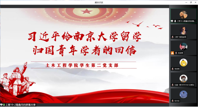 学生第二党支部通过腾讯会议的方式开展了以“习近平给南京大学留学归国青年学者的回信”为主题的党课学习。本次党课由党员葛鑫月同志进行讲解,参加本次党课学习的有二支部全体党员。