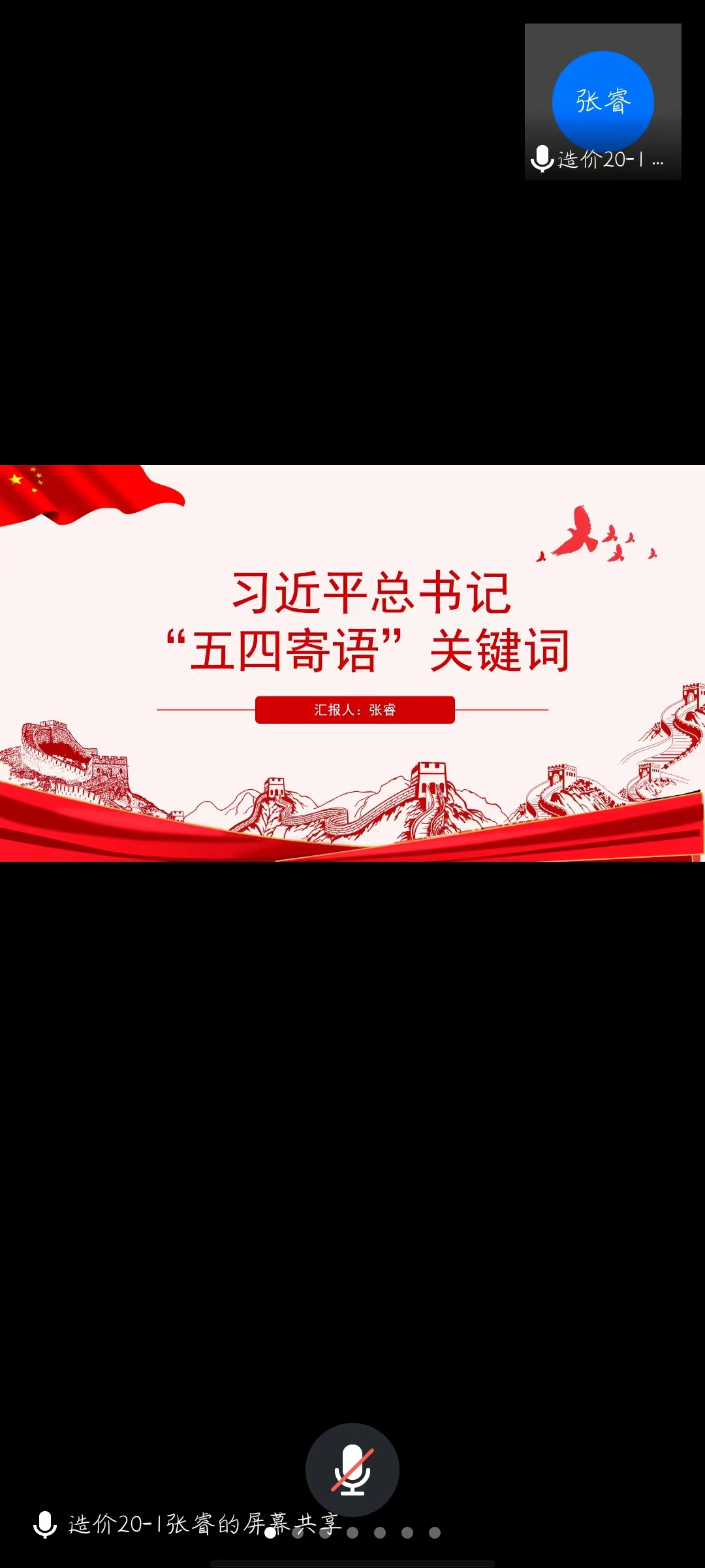 会议由20级造价一班的张睿带领大家学习了以“习近平总书记‘五四寄语’关键词”为主题的内容。首先介绍了五四青年节的由来,重点介绍了习近平总书记提出的“学习”、“价值观”、“创新”、“担当”、“奋斗”等五个关键词的相关内容。习近平总书记用“人生的扣子从一开始就要扣好”的生动比喻,来形容青年养成正确价值观的重要性。同时提出民族复兴的使命要靠奋斗来实现,人生理想的风帆要靠奋斗来扬起。奋斗,是青春最亮丽的底色,是青春应有的姿态。