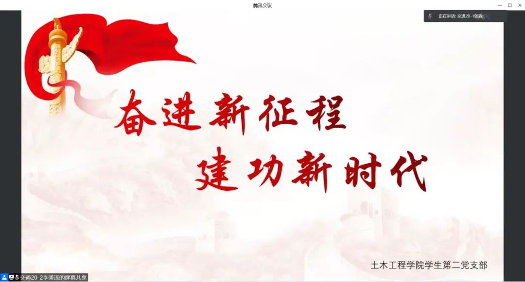 学生第二党支部通过腾讯会议开展了以“奋进新征程,建功新时代”为主题的线上时政宣讲。本次宣讲的主持人为张淼同学,特邀嘉宾为学习党小组的王家凤、张思苹、杨泽佳和郭鹏同学,参加本次时政宣讲的还有二支部全体党员和积极分子。首先,由张淼同学宣布本次时政宣讲开始,她播放了一段两会相关视频,随后由李秉泽同学为大家简单介绍“两会的深刻含义”以及两会相关知识,希望大家认真学习理解。接着,正式进入本次时政宣讲,本次宣讲围绕两会民生篇、经济篇、政治篇和科技篇四个部分展开讲解。