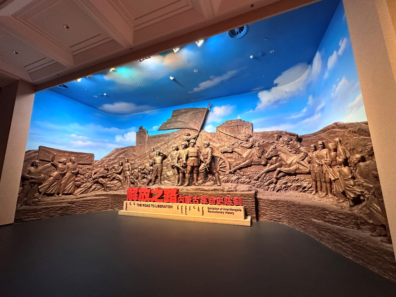 展厅以内蒙古地区革命历程为主线,分四个部分系统展示了波澜壮阔的斗争史诗。在大革命展区,通过珍贵手稿和历史影像,了解李大钊等革命先驱在内蒙古传播马克思主义、团结各族进步青年开展早期革命活动的艰辛起步。土地革命战争展区展现了内蒙古各族人民在党的领导下,冲破封建压迫、开展武装斗争、创建革命根据地的英勇历程,彰显了“团结就是力量”的深刻内涵。抗日战争展区生动再现了大青山抗日根据地的斗争和蒙古抗日游击队等英勇事迹,彰显了内蒙古各族儿女同仇敌忾、共赴国难的爱国情怀。解放战争展区重点回顾了内蒙古各族人民全力支援解放战争、推动内蒙古自治区成立的光辉历史,展示了其在贯彻党的民族政策、促进民族团结方面的里程碑意义。
