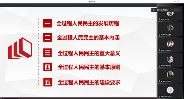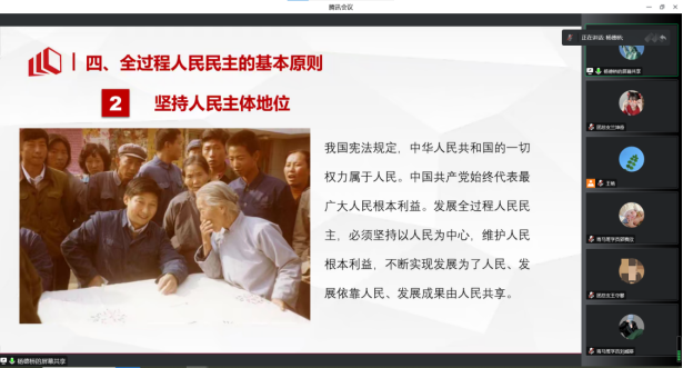 杨德桥老师从全过程人民民主的发展历程、基本内涵、重大意义、基本原则和建设要求五个方面为青马班学员进行了详细的讲解。通过国内外比较、分析真实案例等,使同学们更直观地理解全过程人民民主,是中国共产党团结带领人民追求民主、发展民主、实现民主的伟大创造,是党不断推进中国民主理论创新、制度创新、实践创新的经验结晶。