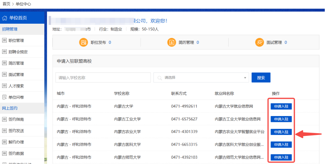 资质审核通过后,进入单位中心,可以选择高校并点击右侧【申请入驻】,填写并提交入驻申请,等待学校管理员审核。学校入驻通过后,“申请入驻”会变为绿色,点击【一键登录】就能免登录进入学校就业网,审核通过后可在该校就业网发布招聘信息。