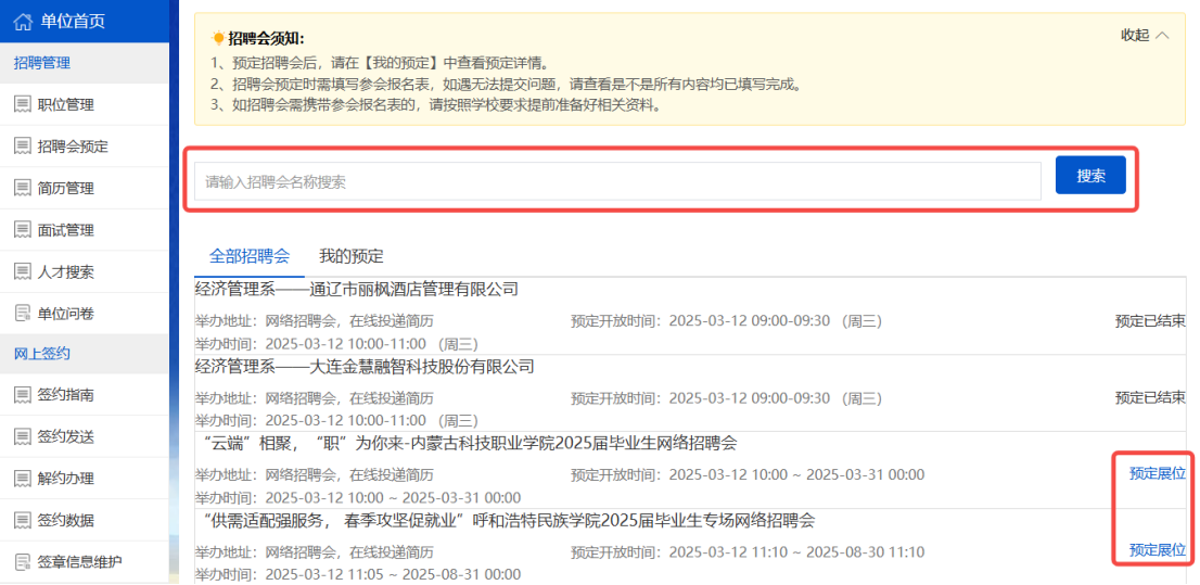 点击【招聘管理】—【招聘会预订】,可查看所有招聘会信息,或根据招聘会名称搜索想要参加的招聘会,点击招聘会右侧的“预定展位”进行报名。注意:预定招聘会时注意预订开放时间,选择仍在有效期内的招聘会进行预定报名。