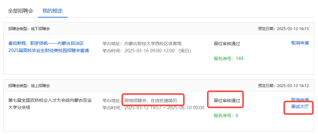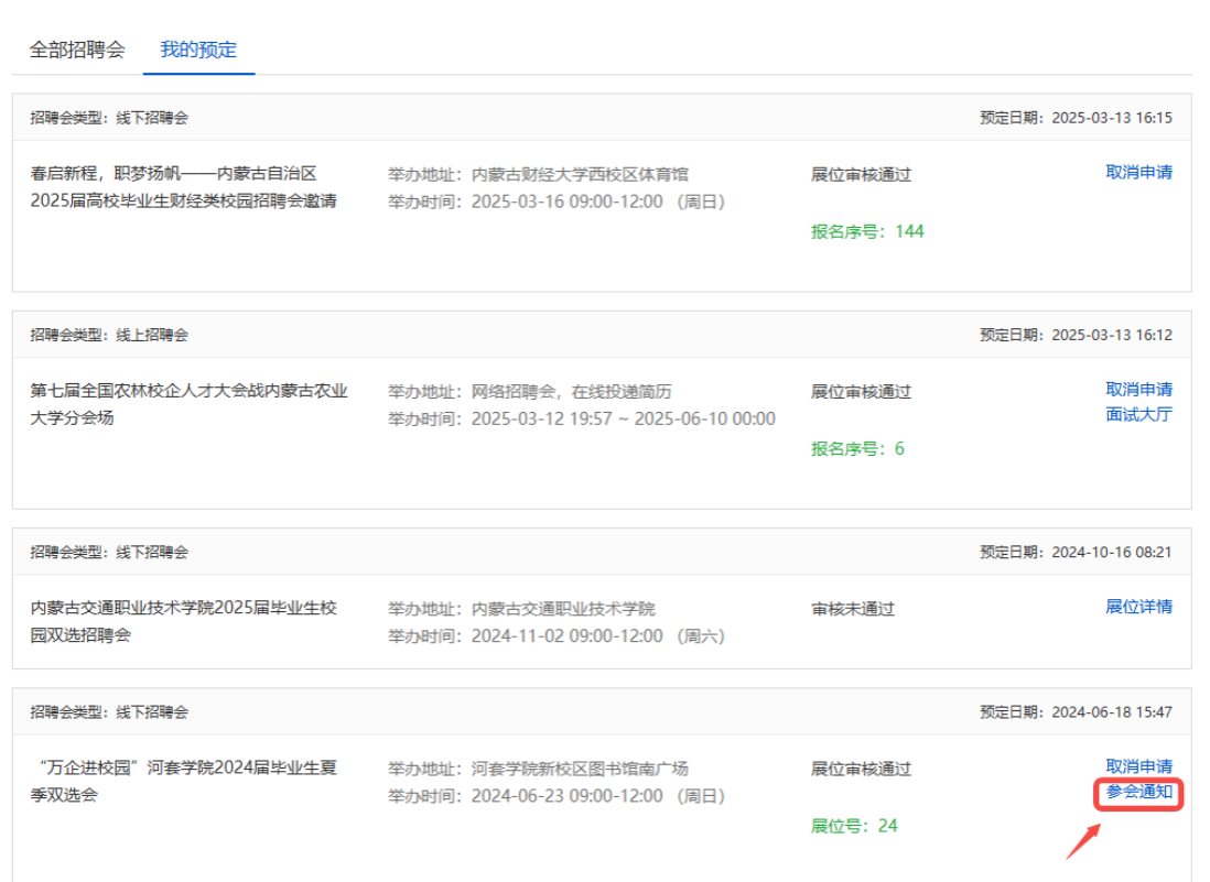 审核结果将发送至单位的注册邮箱,审核通过后,学校会分配对应展位并发送参会通知,用人单位可在【我的预定】中查看、下载,并携带至现场签到。