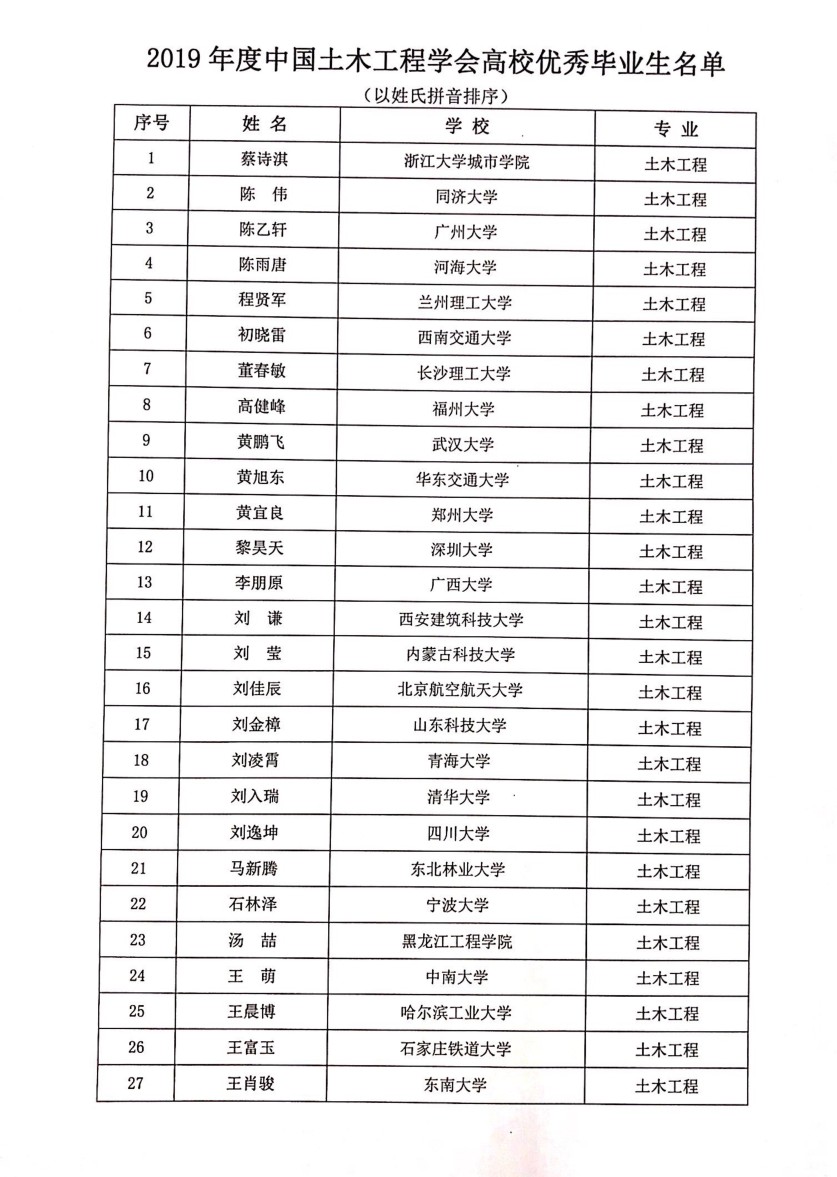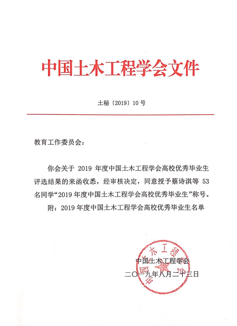 十博体育 土木2015级刘莹同学被评为本年度中国土木工程学会高校优秀毕业生