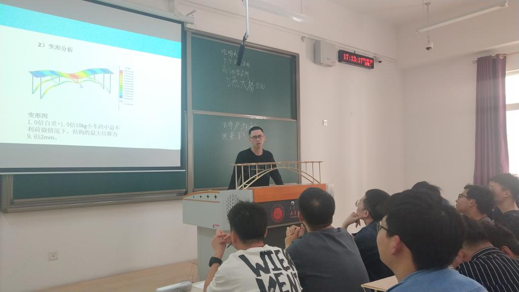 同学们分组利用给定材料自主设计并制作出出“梁、拱、索”三类桥梁结构,在比赛时对结构进行加载、同时给出有限元计算分析结果。而模型汇报、经验总结、答辩研讨等一系列任务,使得学生的学、研、算、讲、辩等多方面的能力得以提升。