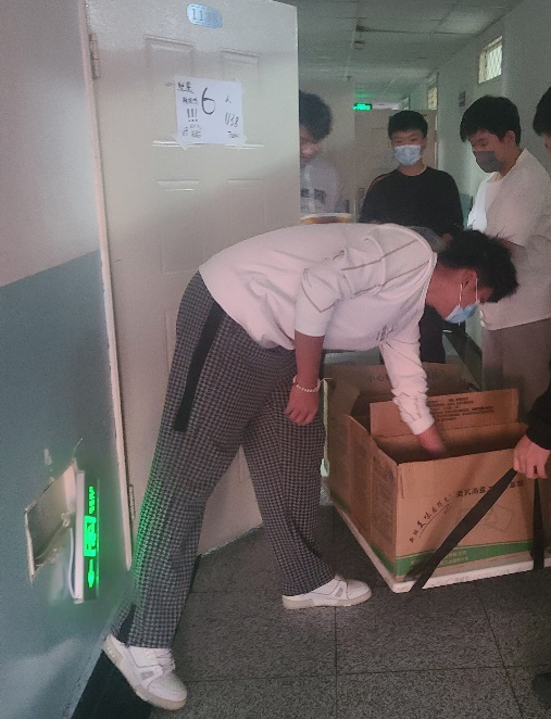 李超同志担任,每天早上配合分管教师领取核酸物资,分配贴签、送样品、签到,叫人、秩序维护等人员分工,每日分配值班人员,使同学们达到佩戴口罩进出宿舍,避免产生楼层间的人员交叉,不串楼串舍,配合老师领取发放同学们的三餐以及水果、口罩,上报同学们的各种生活问题,给同学们尽量解决生活上的问题。