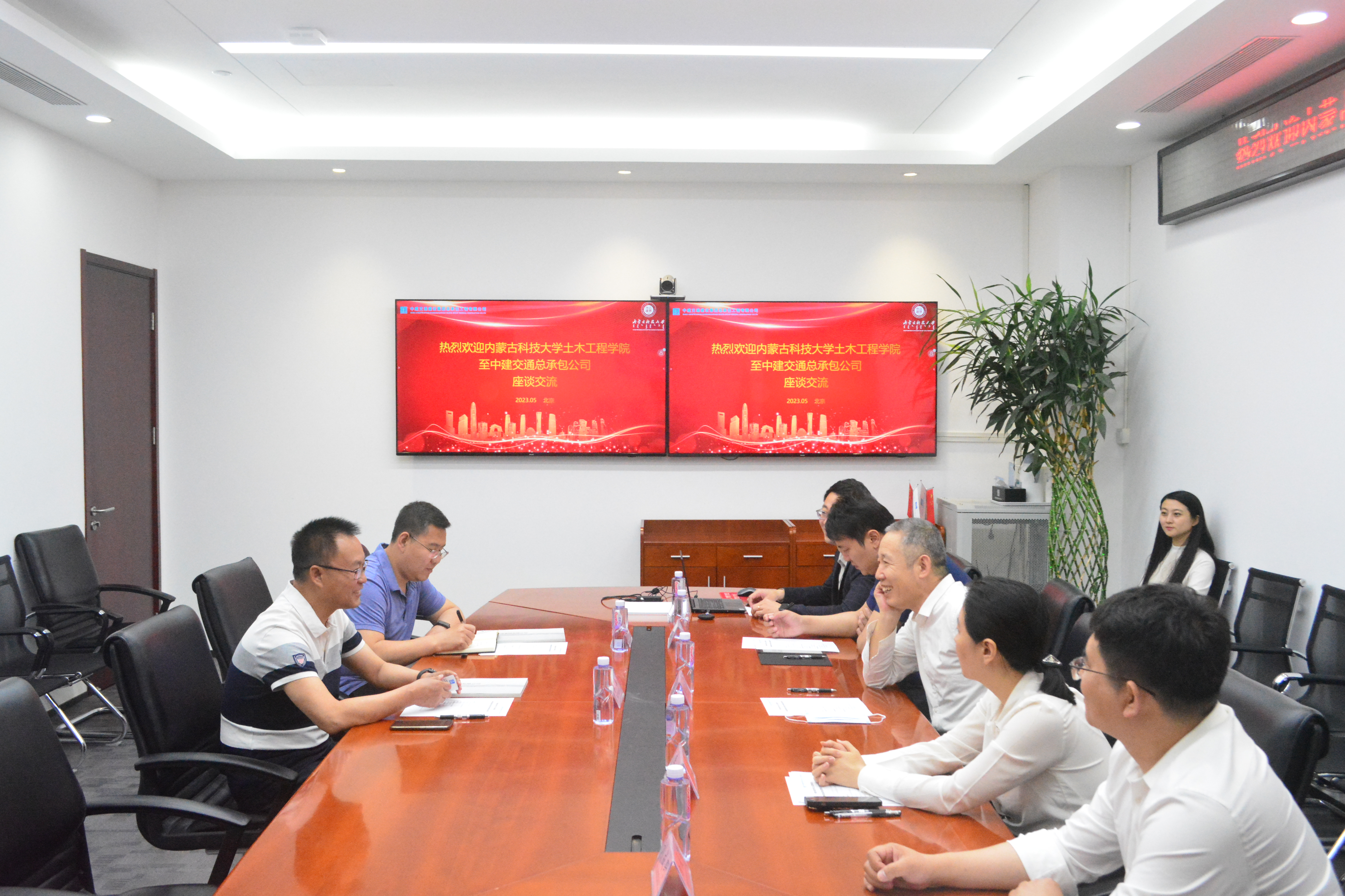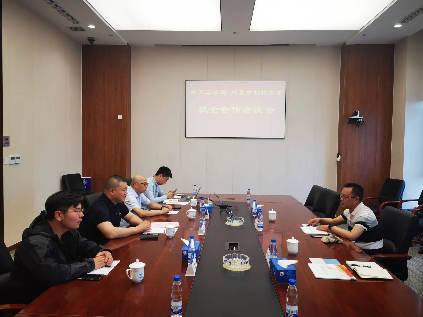 与中交三公局党委委员、办公室主任牛东升,人力资源部副部长黄桦峰进行洽谈