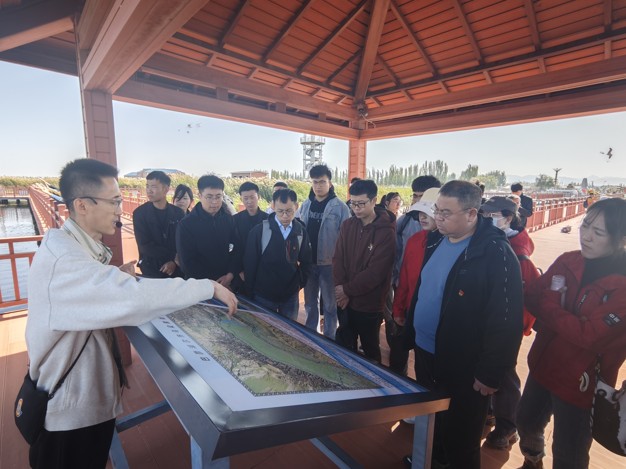 党员们实地参观了湿地候鸟展览馆。馆内陈列着各种栩栩如生的鸟类标本和丰富的图文资料,详细介绍了乌梁素海的鸟类品种以及生态保护的重要性。大家认真聆听讲解,不时驻足观看,对乌梁素海丰富的生物多样性有了更直观的认识