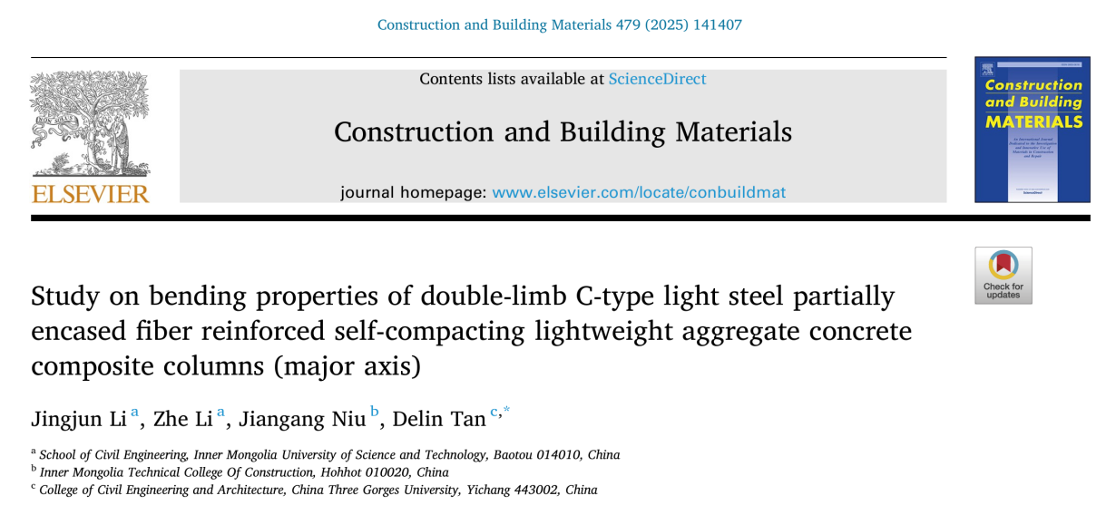 近日,十博体育(中国)官方网站 工业与城市固体废弃物建材资源化利用团队李京军教授在Construction and Building Materials期刊(IF=8.0,中科院1TOP期刊)发表题为Study on bending properties of double-limb C-type light steel partially encased FSLC composite column (major axis)”(DOI:10.1016/j.conbuildmat.2025.141407)的研究成果。