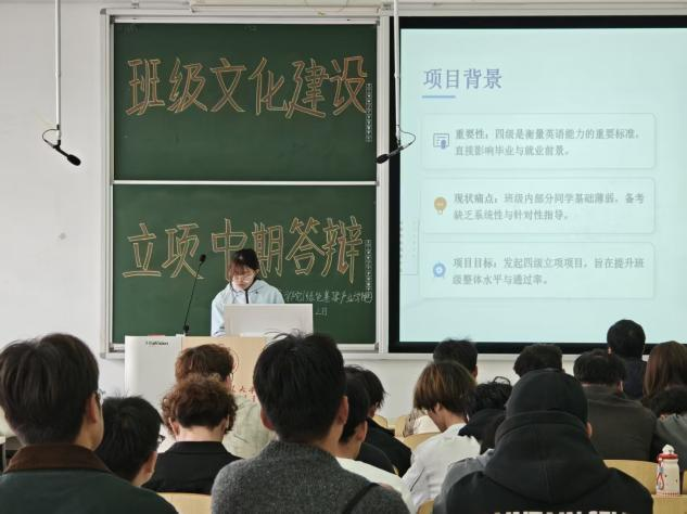 各班级负责人依次上台汇报,围绕立项目标、中期进展、未来规划三大核心内容展开系统阐述,清晰展示了班级在学风培育、文化建设等方面的阶段性成果。汇报内容充分体现了各班级在立项建设中的积极探索与扎实行动。