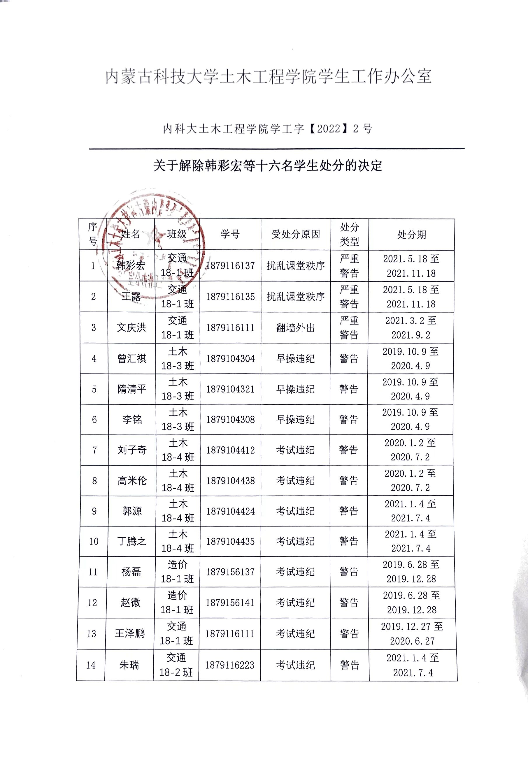 (一)根据《内蒙古科技大学学生纪律处分实施办法》第六章第四十八条有关规定,决定解除以下学生警告及严重警告处分(见附件2)。具体名单如下: