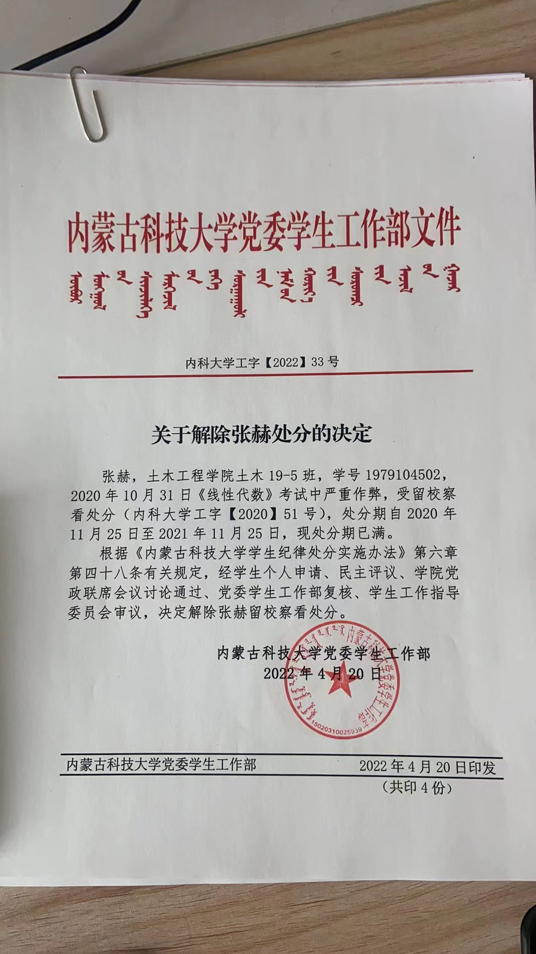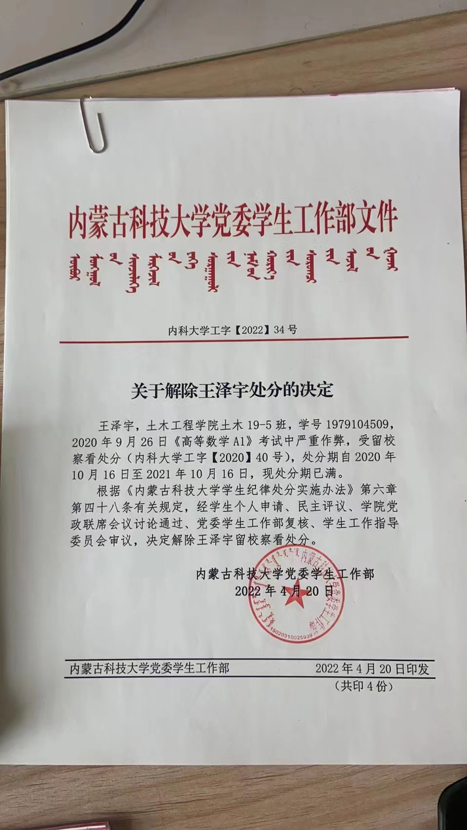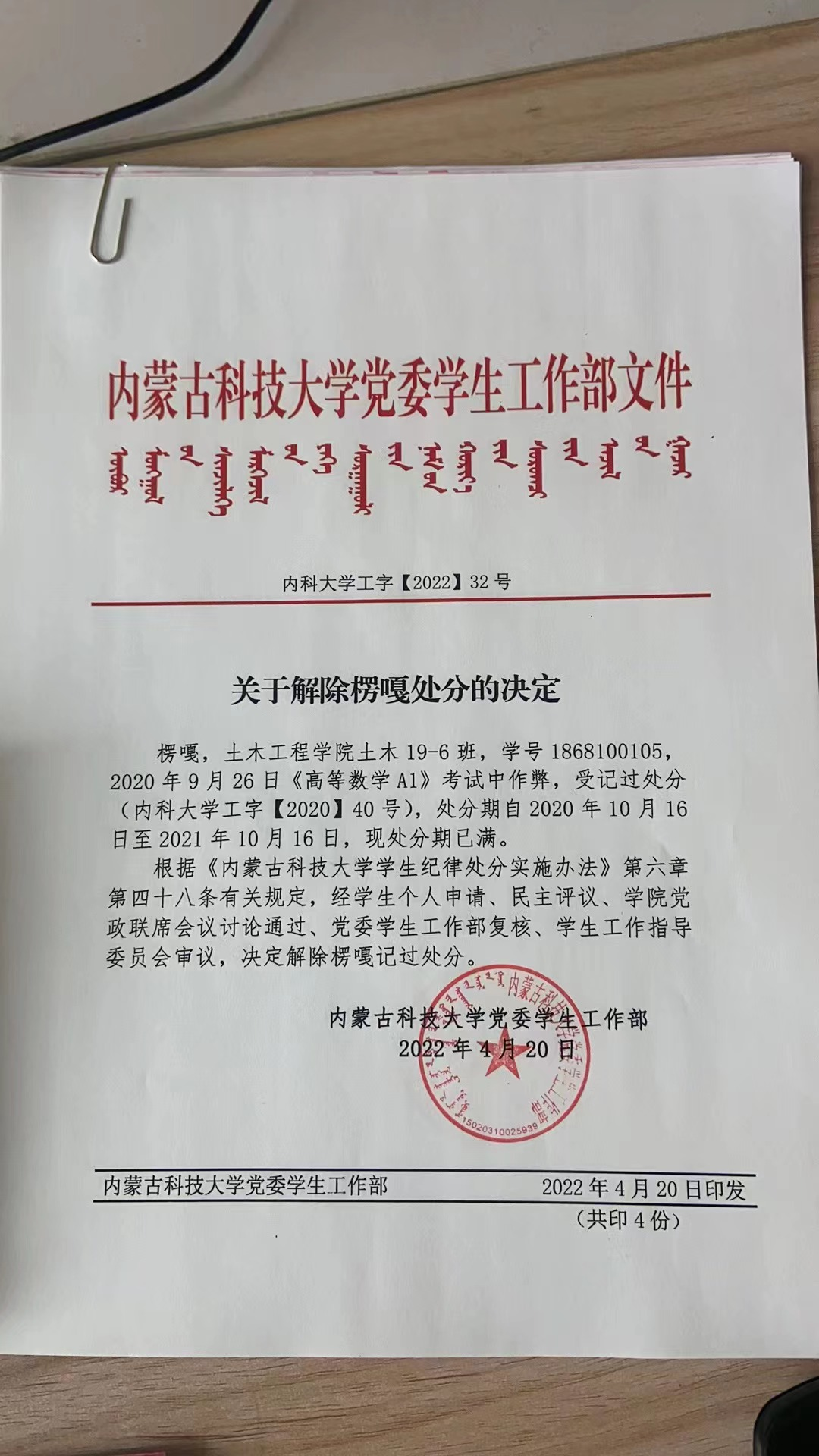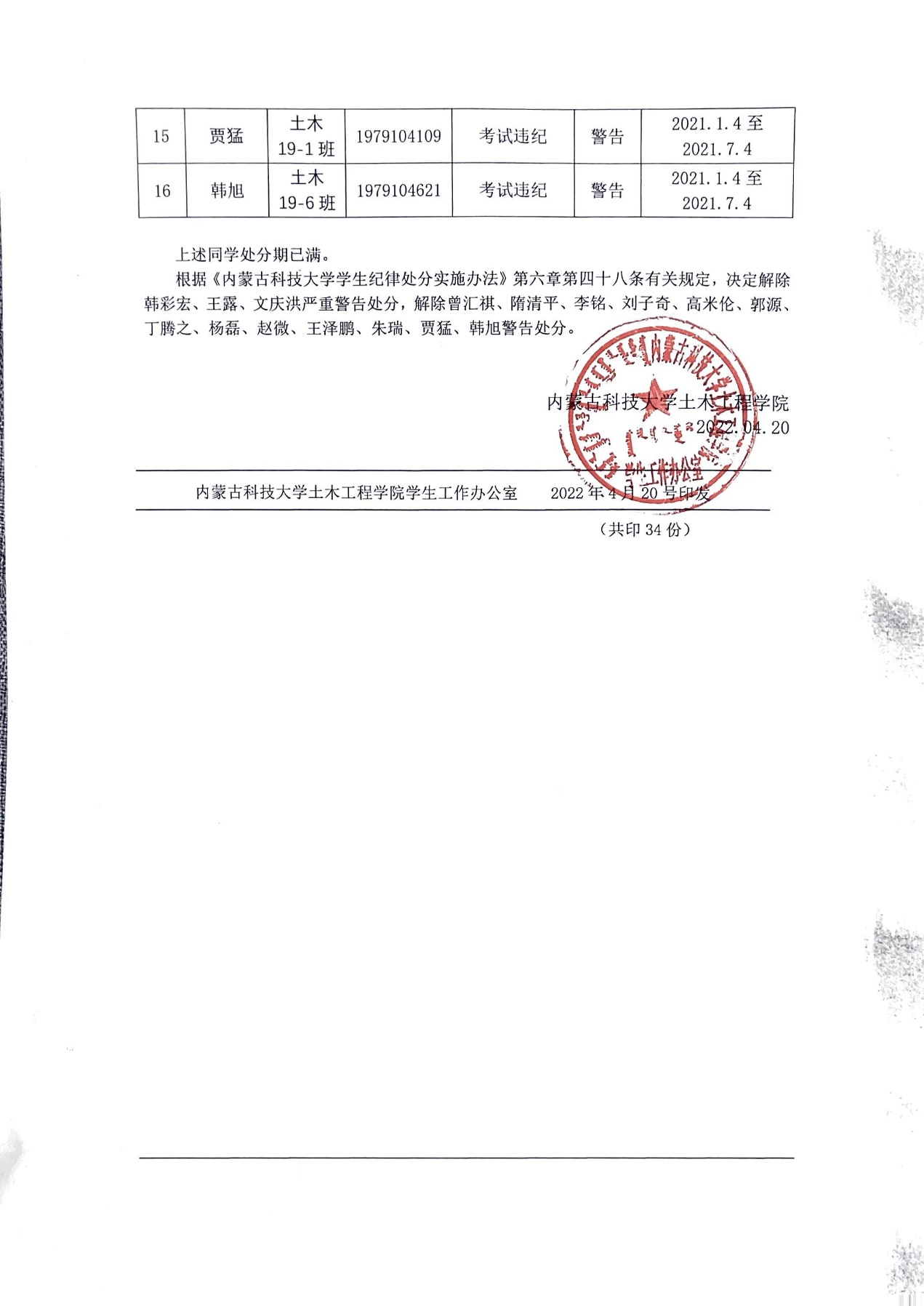 根据《内蒙古科技大学学生纪律处分实施办法》有关规定,对受处分学生进行严格考察,十博体育(中国)官方网站