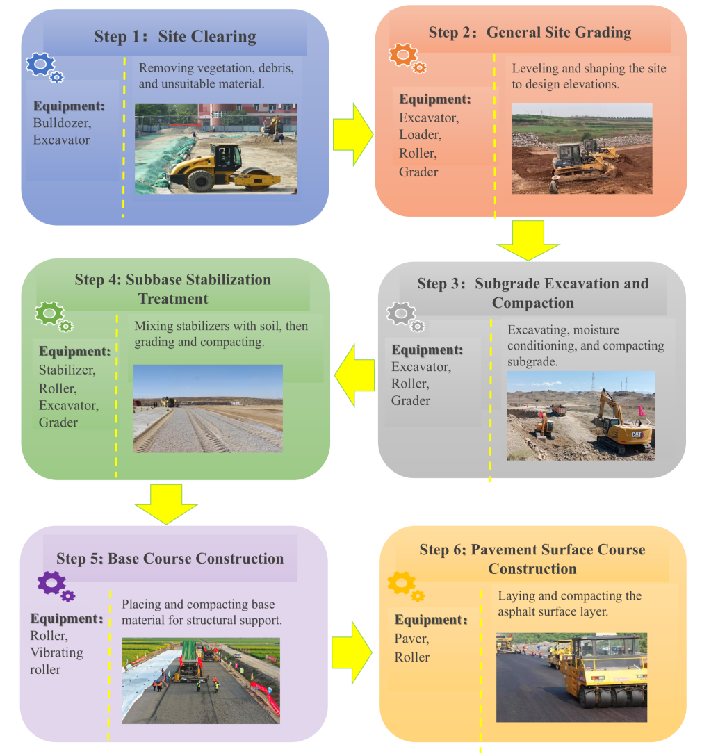 图2. 公路工程施工过程及使用机械