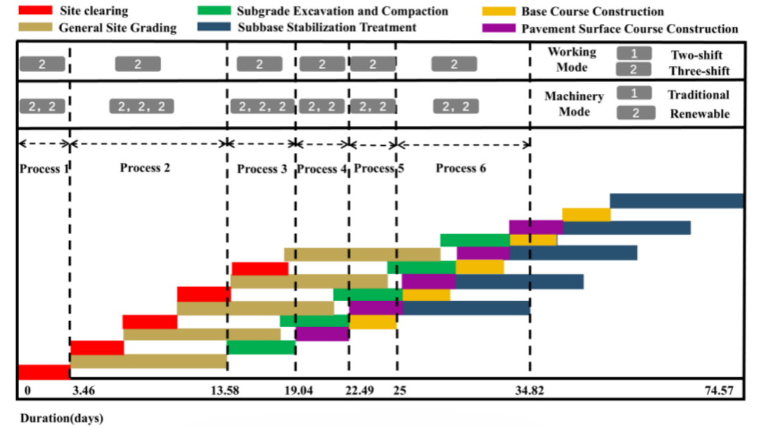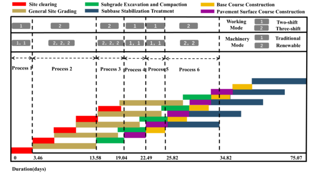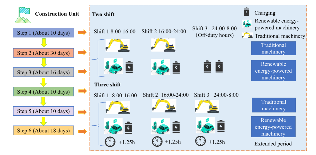 研究结果表明:所提出的 ACEMO-TOPSIS 模型能够实现施工工期、成本和碳排放的综合优化,克服了孤立目标优化的局限性;在灵活的三班制工作体系中纳入可再生能源动力机械,能有效缓解充电中断带来的挑战,填补了调度模型中的一个关键空白;所提出的混合机械调度策略显著提高了系统对现场条件波动和政策约束变化的适应性。通过整合传统机械和可再生能源动力机械,该模型能够根据项目特定优先级(如成本、排放和进度)进行灵活调整,为可持续施工实践提供了有效途径。