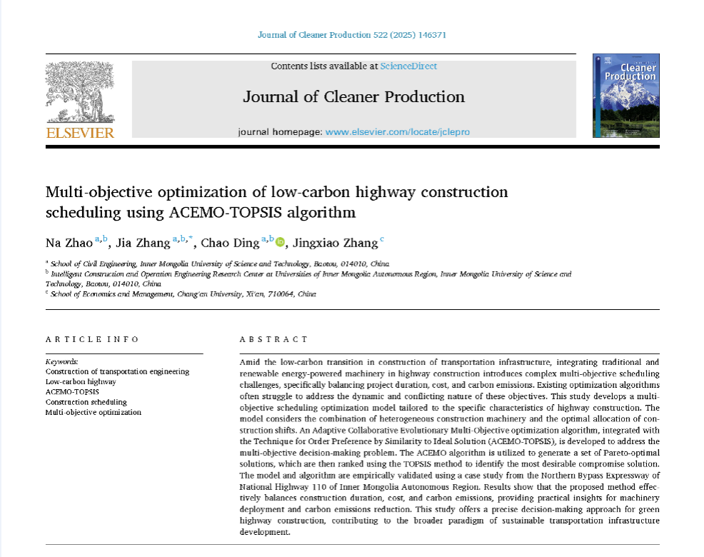 智能建造与绿色可持续发展研究团队赵娜讲师在Journal of Cleaner Production期刊(IF=10,中科院1区Top)发表题为“Multi-objective optimization of low-carbon highway construction scheduling using ACEMO-TOPSIS algorithm”(DOI: 10.1016/j.jclepro.2025.146371)的研究成果。该研究聚焦绿色公路建设中的机械调度问题,构建了传统能源机械与可再生能源机械整合应用的多目标调度模型。该模型考虑了施工机械的组合方式以及施工班次的优化配置,开发了自适应协同进化多目标优化算法(ACEMO-TOPSIS)用于平衡项目工期、成本与碳排放的多目标调度决策问题。基于内蒙古某高速公路的案例研究,对该模型和算法进行了实证验证。结果表明,所提出的方法能够有效平衡施工工期、成本和碳排放,为机械配置和碳减排工作提供了切实可行的见解。本研究为绿色公路建设提供了精准的决策方法,助力可持续交通基础设施发展的更广泛范式转型。