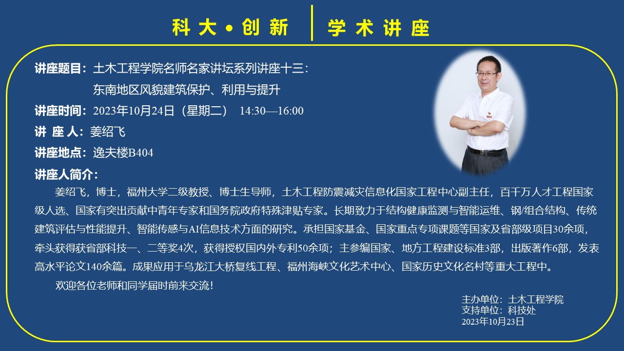 姜绍飞,博士,福州大学二级教授、博士生导师,土木工程防震减灾信息化国家工程中心副主任,百千万人才工程国家级人选、国家有突出贡献中青年专家和国务院政府特殊津贴专家。长期致力于结构健康监测与智能运维、钢/组合结构、传统建筑评估与性能提升、智能传感与AI信息技术方面的研究。承担国家基金、国家重点专项课题等国家及省部级项目30余项,牵头获得省部科技一、二等奖4次,获得授权国内外专利50余项;主参编国家、地方工程建设标准3部,出版著作6部,发表高水平论文140余篇。成果应用于乌龙江大桥复线工程、福州海峡文化艺术中心、国家历史文化名村等重大工程中。
