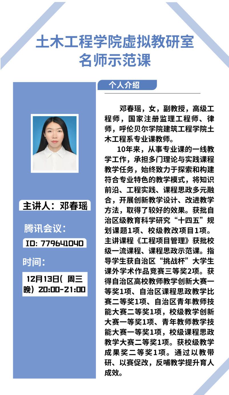 虚拟教研室“名师示范课”系列第三场活动圆满落幕。邓春瑶副教授以“工程项目管理课程的教学创新与实践探索”为主题,通过腾讯会议平台呈现了一场跨界融合、理念创新的教学示范,吸引了全国多所高校教师与行业专业人士的积极参与。