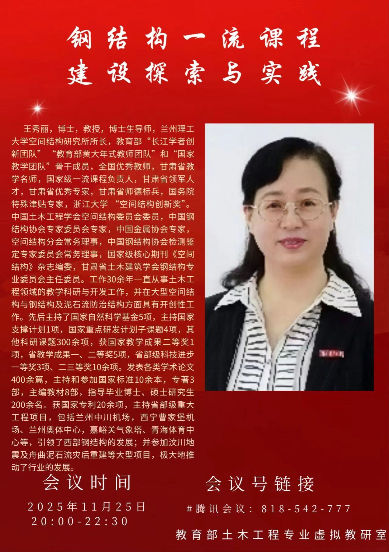 2025年11月25日晚,教育部土木工程专业虚拟教研室成功举办本年度压轴名师示范课。兰州理工大学王秀丽教授以"钢结构一流课程建设探索与实践"为主题,通过腾讯会议平台分享了其三十余年教学科研积淀的宝贵经验,为全国土木工程教育工作者呈现了一场高水准的课程建设盛宴。
