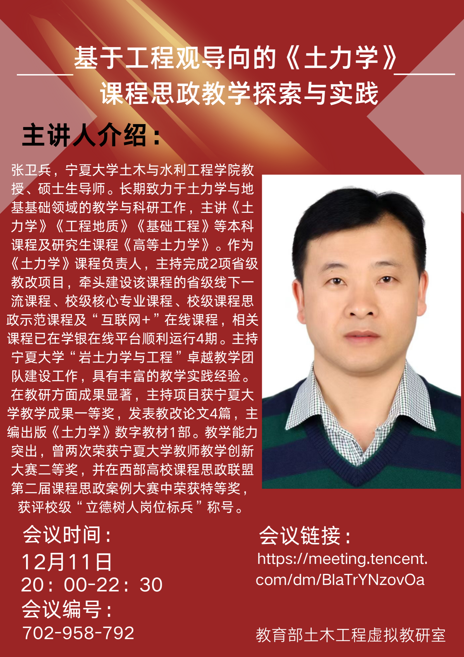 2025年12月11日晚,教育部土木工程虚拟教研室系列示范课再启新篇。宁夏大学张卫兵教授以“基于工程观导向的《土力学》课程思政教学探索与实践”为主题,通过腾讯会议平台进行了深度分享,为全国土木工程专业教师呈现了一场将专业教学与价值引领有机融合的教学创新范例。