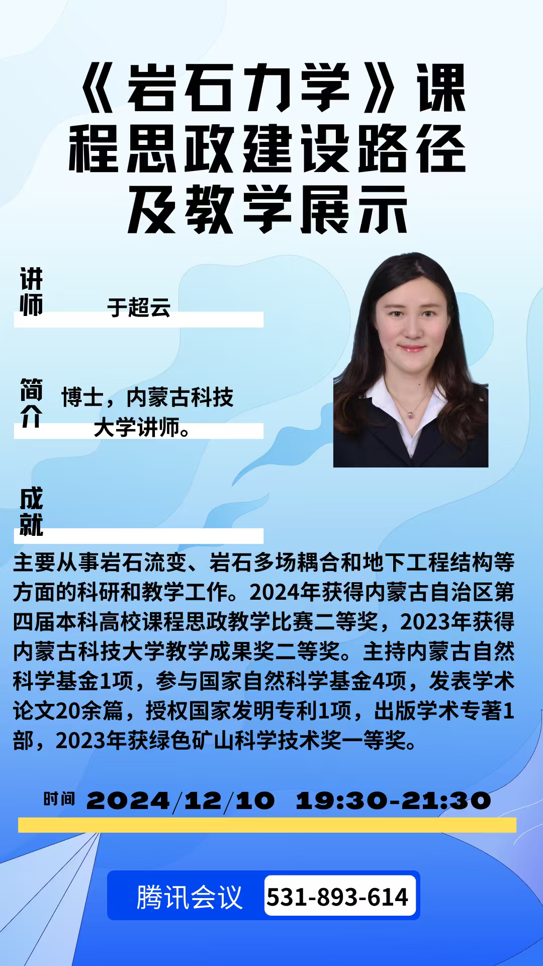 2024年12月10日晚,一场聚焦岩石力学与地下工程的高水平示范课在线上举行。本次课程由内蒙古科技大学讲师于超云博士主讲,围绕“岩石力学”课程的教学设计与实践展开,为参与师生呈现了一场融合基础理论与前沿应用的学术课堂。